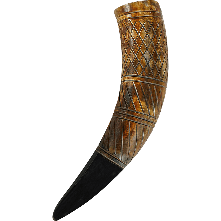 Sip from the Alfheim Carved Drinking Horn and feel as though transported back to an era of legend and adventure in a cold, northern land. Carved crossed lines and slashes accent the multicolored natural Viking horn. This Viking horn is both safe for drinking from and beautiful to display. The bottom tip of the horn is darkened for intriguing contrast. For your next Viking feast or get-together, or for bringing Norse style to your decor, choose this carved natural drinking horn.