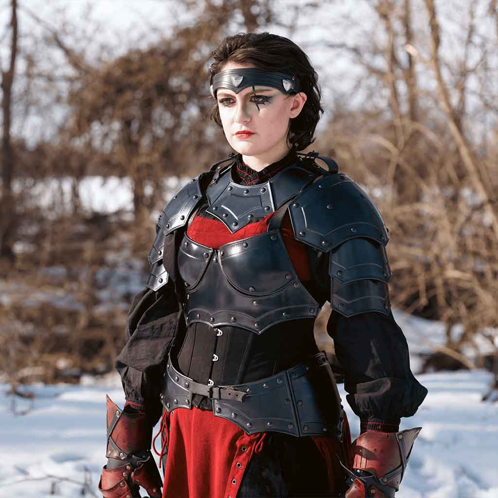 Tailored to the female form, the Blackened Mina Chest Armour offers a great look for shieldmaidens, lady knights, and warrior princesses. The steel armour features a dark metal finish and decorative rivets along the edges. Shoulder straps connect the womens breastplate to a small shield in the back, allowing size adjustments. Please note that the steel breastplate is not adjustable, which may restrict who the breastplate will comfortably fit. The chest armour cuts off at the midriff, allowing the torso to rotate and move with relative freedom. Be sure to check out our other Mina-style armour when creating your next outfit for LARPing, re-enactments, or the Renaissance fair!