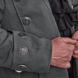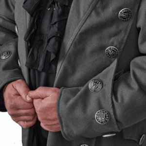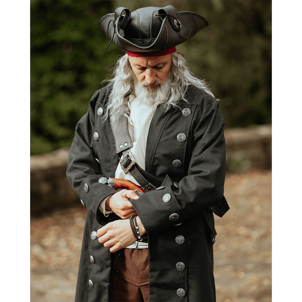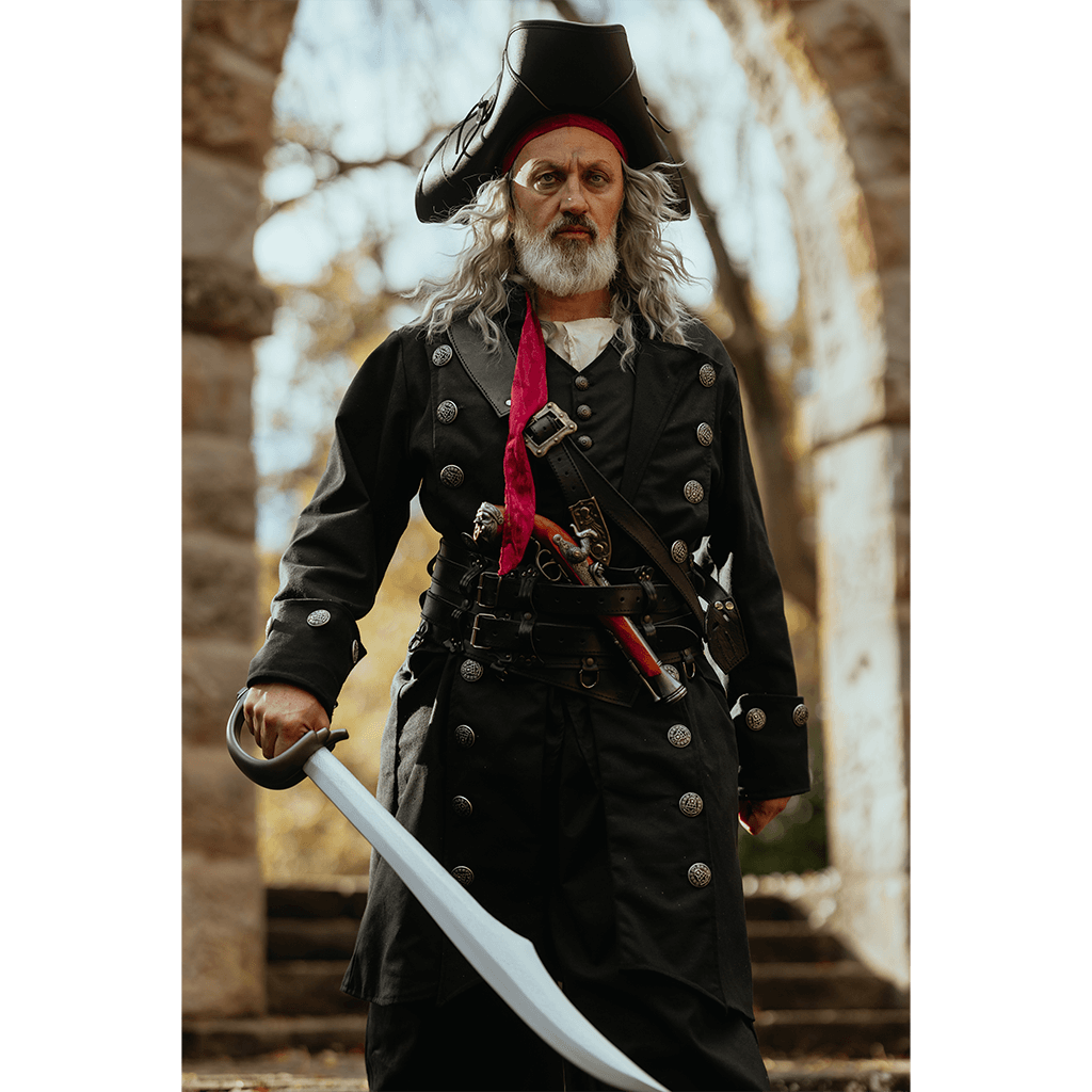 Gorgeous antiqued silver tone buttons accent the historical pirate coat along each side. These buttons are decorative; the coat cannot be worn buttoned. The same buttons add detail to the dramatic sleeve cuffs. The functional side pockets also secure with matching buttons through their top flaps. In the back, the coat is slightly adjustable with buttons through a tab at the back of the waist. Beneath that, this buccaneer coat is slit along the back for unhindered mobility.