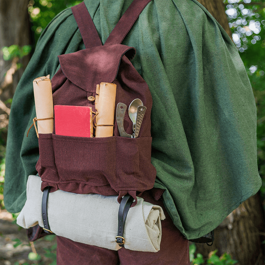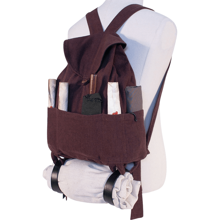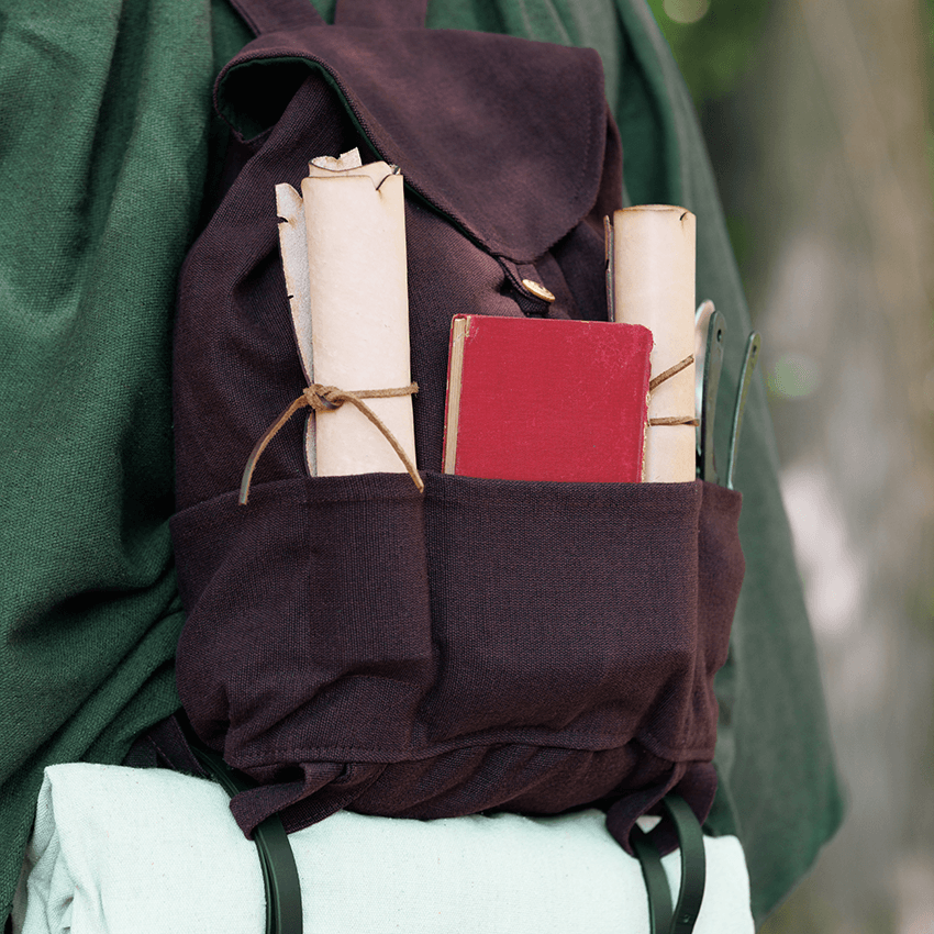 On the front, the backpack features a flap at the top. It closes with a round button and opens to reveal the internal pocket. The pocket has a cotton lining. Below the front flap, there is a series of external pockets. These pockets are great for storing various pieces of gear like telescopes, maps, and more. At the bottom of the backpack, there are four loops. These loops help with attaching even more gear, not included. The back loops are also useful for tying the shoulder straps. Take this backpack on a medieval or fantasy adventure. The Capsus Cotton Backpack looks great at a roleplaying event or cosplay convention on many characters.