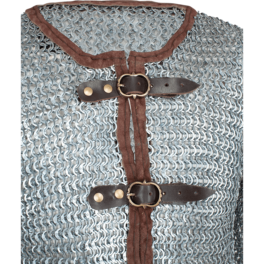 Leather trim lines the round collar all the way down the front, making sure you’re protected while staying comfortable. The hauberk has an opening at the front of the hem for added mobility. This one size chainmail torso covers you from the shoulder to just past the waist, ensuring your protection.
