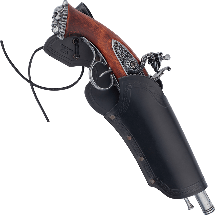 When gathering a posse or shooting a show down, the LARPer or reenactor needs somewhere to hold a gun. Place your display pistol in the Dragone Pistol Holder. Available in two colors of premium leather, this holster comes in large and small. It can attach to the role-player with a belt loop on the back side. An antique patina and embossing decorates the piece. Metal rivets hold the holster together. Also the holster has holes for the included tie. Command the Wild West or Steampunk City at any historical convention or fantasy event.