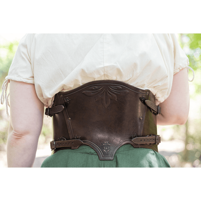 Embossed with imagery befitting the Middle Ages, the Floral Isolde Leather Bodicenot only increases your style during roleplay, but raises your defense during LARP warfare or when sparring with your fellow adventurers. The corset is fashioned from six riveted segments of high-quality leather. An antique patina finish and embossed imagery lend it a beautiful, distinctive air. Floral accents decorate the front and back midsections. Two adjustable buckle straps adjust the fit at each side. Command both respect and style on the LARP battlefield with the Floral Isolde Leather Corset.