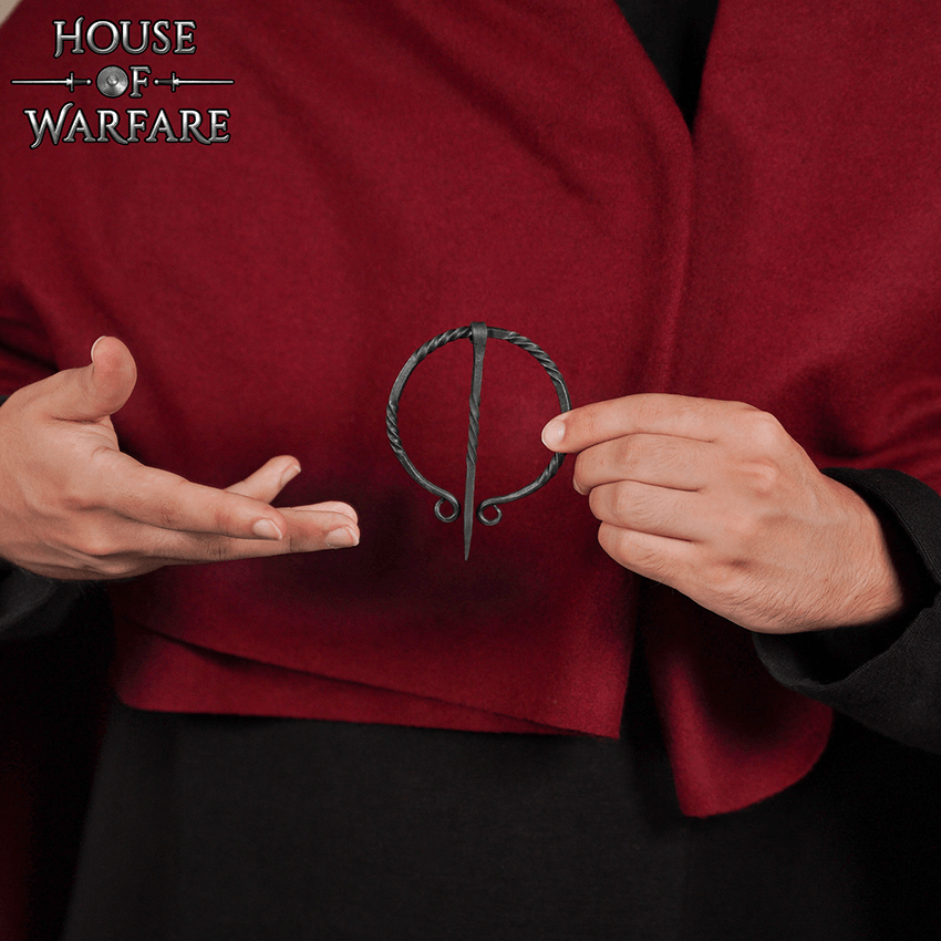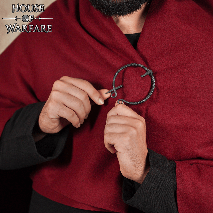 Accent your cloak, cape, shawl, or even a tunic with the Historic Penannular Brooch. This open ring cloak pin is handcrafted from wrought iron and has a twisted texture interspersed through its round frame and moveable, tapered pin. The penannular cloak pin has a small opening, its ends turned back into small loops. The attached, tapered pin can move along the Viking ring brooch for easily adjusting in place. Add historical style and function to your medieval, Renaissance, Viking, or fantasy outfit with this wrought iron historical brooch.