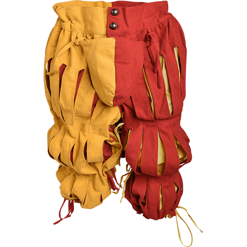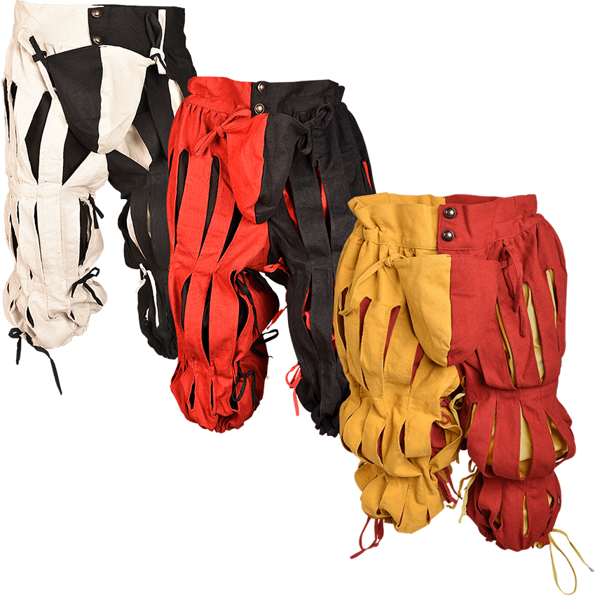 Become a mercenary soldier of the Middle Ages with the Joerg Landsknecht Trousers. These cotton canvas medieval pants have a split color scheme and stylish slashes in the top fabric layer of each puffed, segmented pant leg. The wide waistband has an inner drawstring for adjustability as well as antique brass-tone buttons that fasten the band at the front. Beneath the waistband are loops for securing the ties of the included matching codpiece. Each pant leg is cinched twice with adjustable fabric ties to create the puffed, segmented look before ending in a drawstring cuff that falls below the knee. Available in a variety of colors and sizes, these medieval landsknecht pants are perfect for adding unique style to a variety of medieval looks, from soldier or merchant to member of nobility.