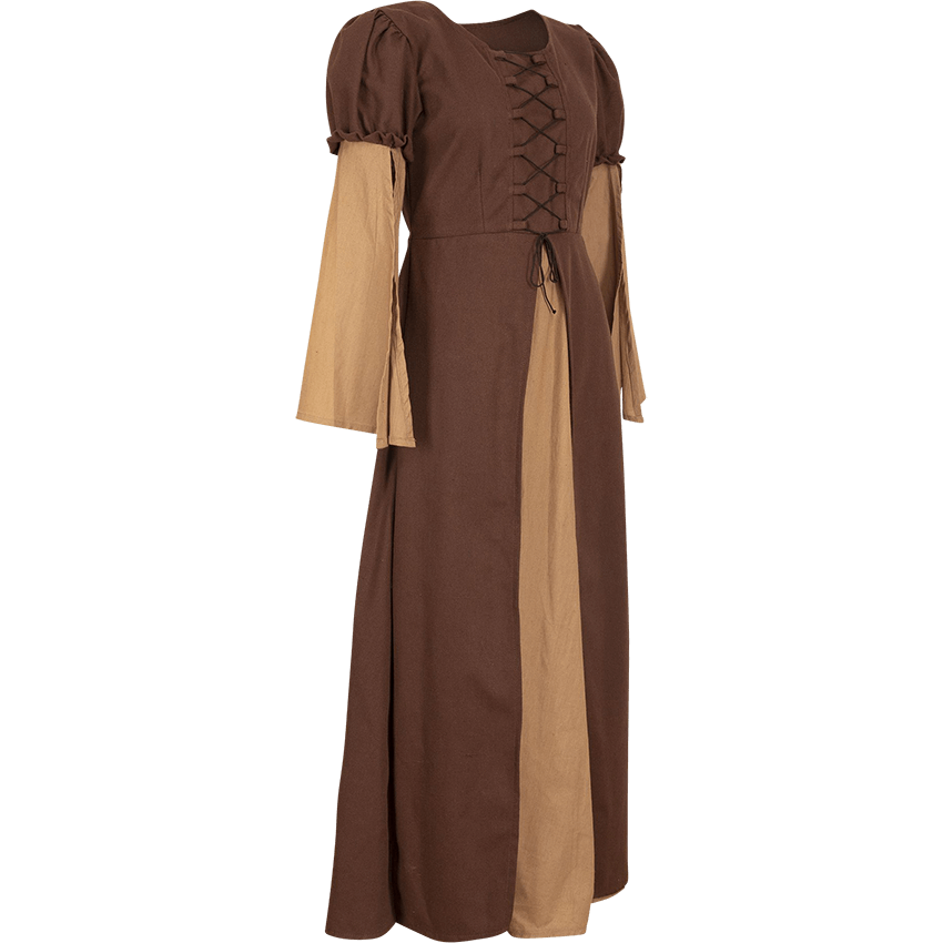 Relive history with an authentic medieval dress that’s full length and comes in multiple color combinations. The first color is the dress’s outer layer, which is the bodice and most of the skirt. The longer sleeves, the front skirt panel, and trim on the bodice are the secondary color. With its range of sizes, this dress accommodates diverse body types, making everyone feel like they belong in the medieval times. It’s sewn at the hips for a snug fit and shows off your figure. In the front, decorative lacing adds more detail to the dress. At the back, the lacing is adjustable and ensures you get the perfect fit. Each full-length sleeve has a slit from the upper arm down to the cuff. This ensures breathability and an extra detail to appreciate.