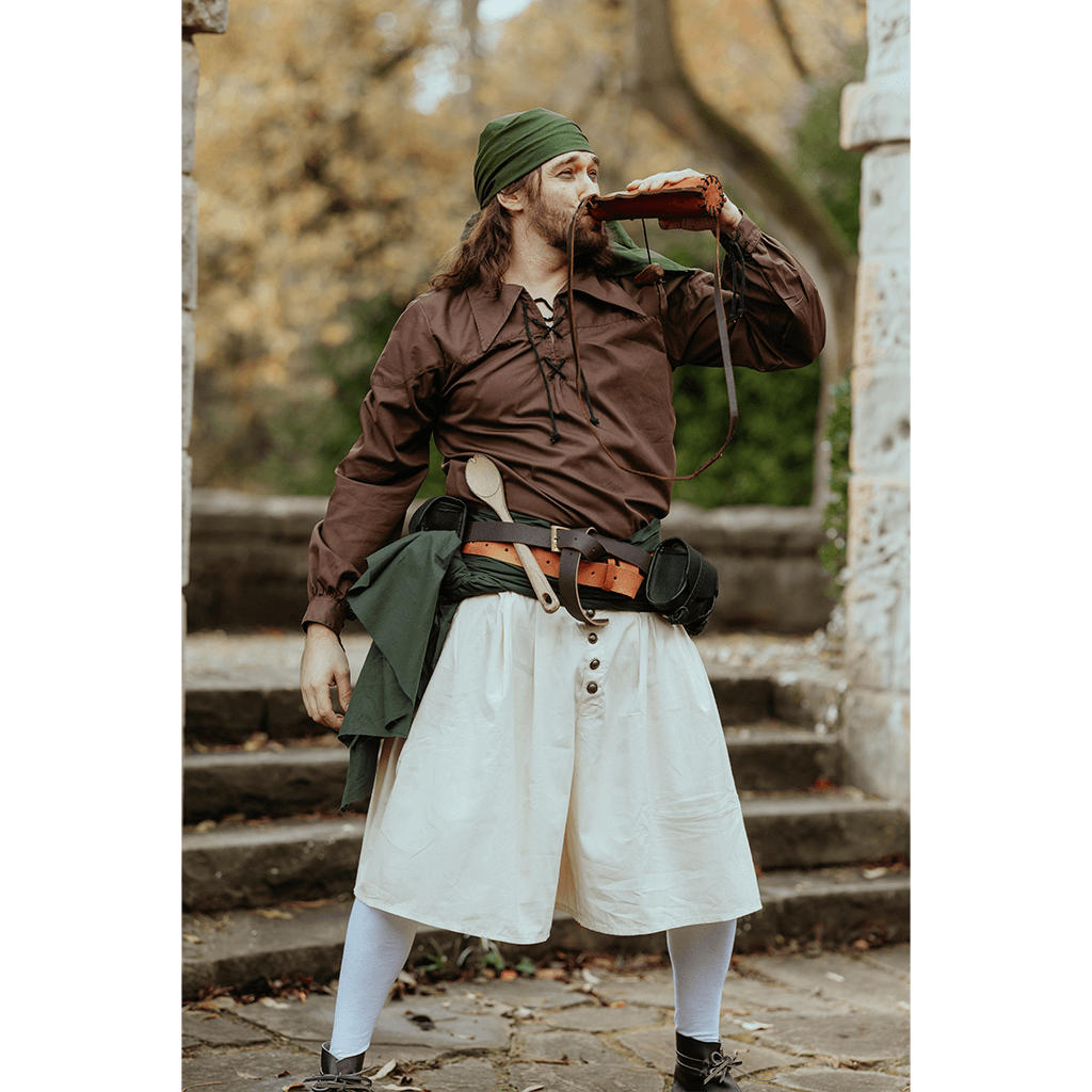 When you head out on the seven seas to sail for treasure, make sure that you are comfortable by wearing the Matey Cotton Pirate Pants. Made from light cotton, these pants come in one color and a range of sizes. The front fly buttons up in front with seven buttons. Also, the waistband adjusts with a strap in the back. There are belt loops around the waistband as well. The pants end near the knee and have a loose, flowing cut. This wide cut allows for greater mobility of the wearer. These pants are great for any sea-bound character to wear to a LARP event, cosplay convention, and more.