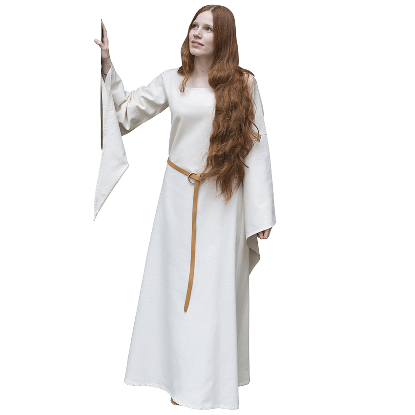 The classic image of a medieval noblewoman often involves lavish, gold-trimmed dresses with long, flowing sleeves. The Medieval Trumpet Sleeve Underdress takes this famous design and removes the elitism, making it accessible to all. This ankle-worn undergarment is loose-fitting, allowing for comfortability and freedom of movement, but it still allows a larger dress to be worn over it. Its long sleeves, ending in a bell design, serve the functional purpose of keeping you warm as well as the decorative purpose of granting your wardrobe a lavish appearance. Its square neckline makes it a versatile piece of underwear that matches a variety of medieval outer dresses. The Medieval Trumpet Sleeve Underdress makes a fantastic addition to any medieval or Renaissance ensemble.