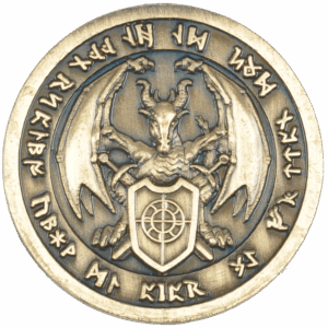 Fill your pockets, pouches, and treasuries with the Set of 10 Gold Fire LARP Coins, and find yourself immersed in an ancient realm of magic and flame. Each identical coin in this 10 piece set is highly detailed for an authentic feel. These golden tone, antique finished coins are made of galvanized zinc and nickel with intriguing and elaborate designs decorating both coin sides. On the front of each coin, a fearsome dragon with outspread wings stand behind a sword and shield crest. An arcane and intricate symbol surrounded by runes decorates the reverse. Whether you are looking for the right currency for your fantasy realm, a way to add a new dimension of realism to tabletop gaming and live action roleplay, or a unique addition to your coin collection, these golden dragon coins are sure to impress with their undeniable style and might.