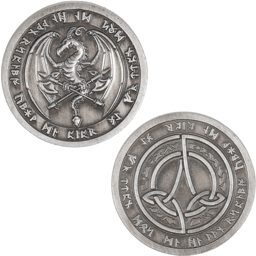 Even realms of fantasy ought to have the proper currency. Fill your treasuries, pockets, and belt pouches with coins from the Set of 10 Silver Fire LARP Coins. These antique, silver tone coins all feature a fearsome dragon design. Made of zinc with galvanized nickel plating, these intricately detailed fantasy coins sport an antique finish for rustic authenticity. Realistic in both coloration and feel, each identical round coin is decorated on both sides with inspired imagery. On the front, each coin displays a dragon perched on crossed speers, its magnificent wings outspread. On the reverse, a Celtic-knotwork inspired symbol is further adorned with a border of runes. Bring new dimension to your tabletop gaming and live action roleplay campaigns when you incorporate this set of fantasy currency into your treasury. These gaming coins also make fine collectibles and gifts for any fans of dragon-themed fantasy.