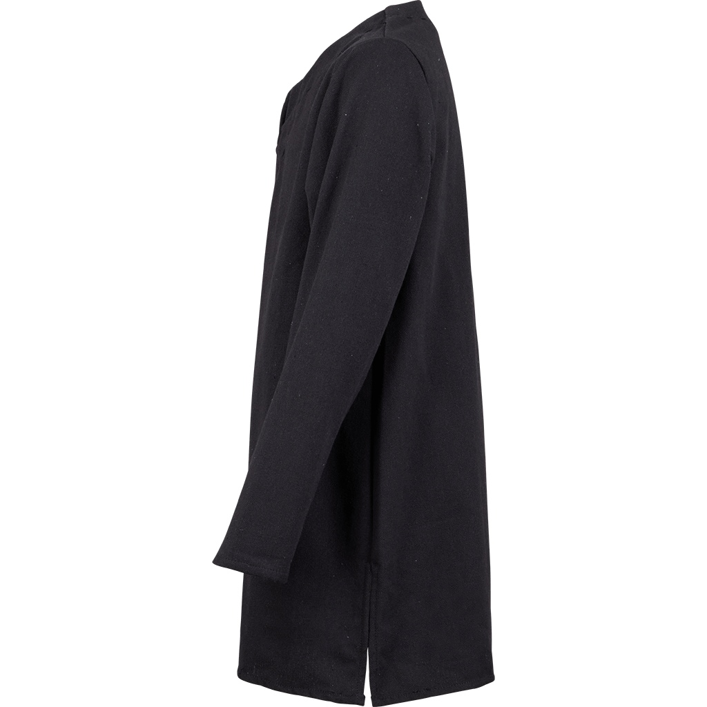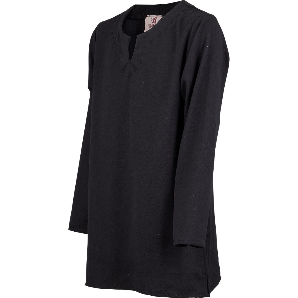 There are two colors available for this long sleeve tunic: Brown and Black. Brown is great for creating a natural, down-to-earth presence. Black is bold, sophisticated, and ambitious, a color well-suited for all kinds of characters. At the top, this historical tunic has a round neckline with a V-shaped slash in the center. Decorative stitching around the neckline adds another layer of depth and detail. The tunic ends past the waist on most children and has a more relaxed fit for historical style. Long, fitted sleeves end with wide cuffs right above the wrists. There are shallow slashes on each side of the hem for more mobility.
