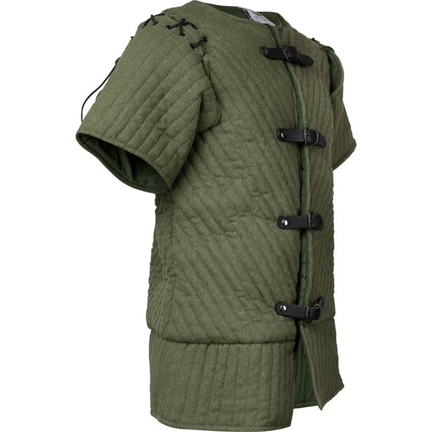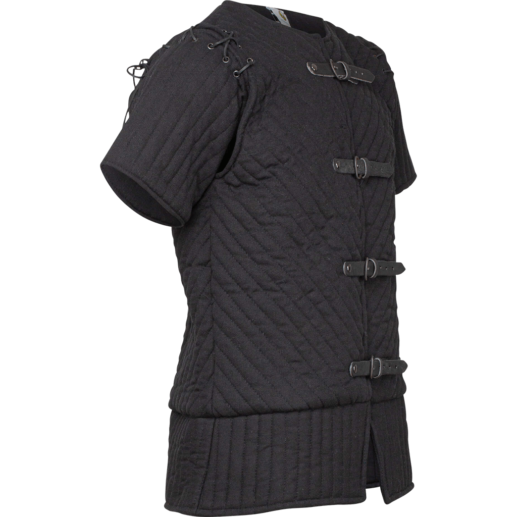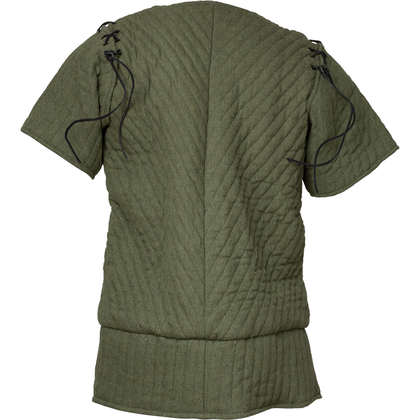 Around the waist, this short gambeson then flares out slightly into two tails. These tails have a split in the middle for added mobility. When you wear this padded short sleeve gambeson, the tails cover the top of the thighs. Available in multiple sizes, this padded jacket accommodates a wide variety of figures. This ensures everyone can feel like they belong in the age of chivalry. There are two colors available for this arming jacket: Black and Olive. This allows you to choose the color that matches your harness or outfit. Please note that this handmade LARP gambeson is made from natural materials, and the color may vary.