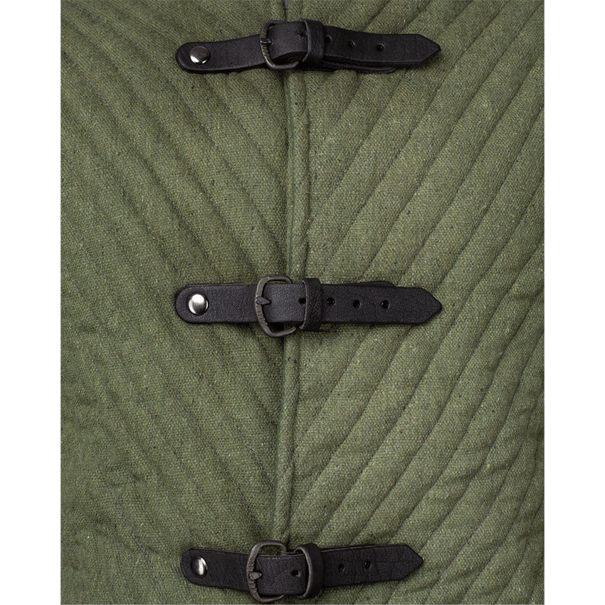 At the top, this defensive jacket has a round neckline. The padded gambeson has four buckled straps down the front, making it easy to wear. These straps are adjustable and have notched buckles for added detail. The straps are also riveted to the body for added strength and durability. The short, wide sleeves end around the elbows, leaving your hands free for wearing gauntlets or gloves. These sleeves are laced to the shoulder at the top. The leather lacing are looped through metal eyelets and can be removed to detach the sleeves. These detachable sleeves make this padded doublet a versatile piece. You can remove the sleeves for hotter days or for styling a unique look.