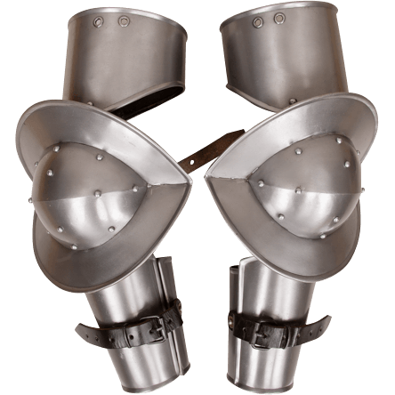 This medieval arm armour, sold as a pair, is designed as three distinct parts connected together. Forged from 18 gauge mild steel, this Mytholon armour piece is capable of standing up to intense LARP combat. This armour is also coated in oil to protect from rust. At the top, the upper rerebrace, also known as the upper cannon that guards the bicep, is a solid band and angled so you can slip your arm through and your movement will be unhindered. There are two eyelets at the top of this rerebrace, perfect for tying to your gambeson, mail shirt, and your shoulder armour alike. Below the rerebrace is the round elbow piece, also known as the couter, with rolled edges and rivets bolstering it. The rolled edges assist in deflecting enemy attacks.