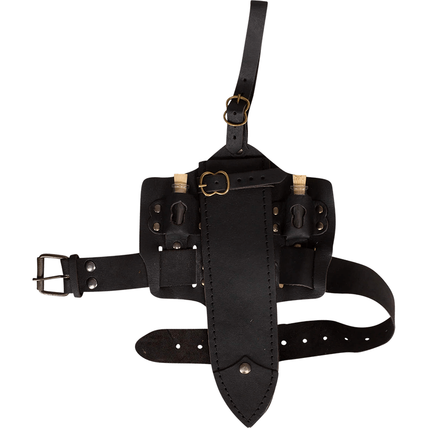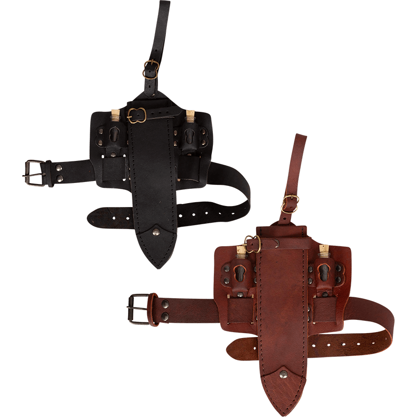 Attach this holster to your belt and buckle at the thigh for a unique fantasy style. This Mytholon Trinity holster is perfect for storing potions and daggers to prepare you for the next LARP battle or role playing event. Wear it with your Renaissance fair costume or reenactment persona. You can fill the included glass potions with whatever you need during your next adventure. Wherever your travels take you, rest assured this medieval fantasy thigh holster is a great choice for holding your questing essentials.